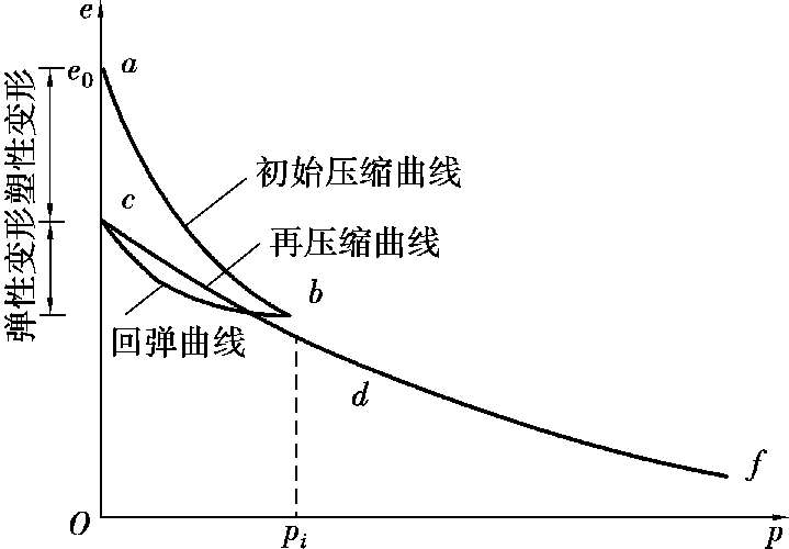 在进行室内试验过程中,当土压力加到某一数值 p i (图3.5 b 点)后,逐渐卸压,土样将发生回弹,土体膨胀,孔隙比增大,若测得回弹稳定后的孔隙比,则可绘制相应的孔隙比与压力的关系曲线(图3.5 c 点),这种曲线称为回弹曲线。