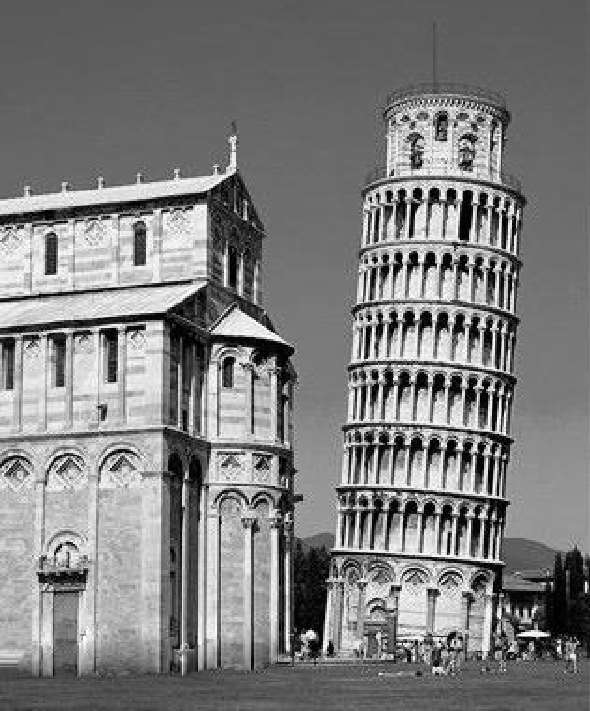 建于1173年的比萨斜塔从地基到塔顶高58.36m,从地面到塔顶高55m,钟楼墙体在地面上的宽度为4.09m,塔顶宽2.48m,总质量约14 453 t,重心在地基上方22.6m处。圆形地基面积为285m 2 ,对地面的平均压强为497kPa。倾斜角度为3.99°,偏离地基外沿2.5m,顶层突出4.5m,1174年首次发现倾斜,如图0.1所示。比萨斜塔之所以会倾斜,是由于它地基下面土层的特殊性造成的。比萨斜塔下有好几层不同材质的土层,各种软质粉土的沉淀物和非常软的黏土相间形成,而在深约1m的地方则是地下水层。这个结论是在对地基土层成分进行观测后得出的。