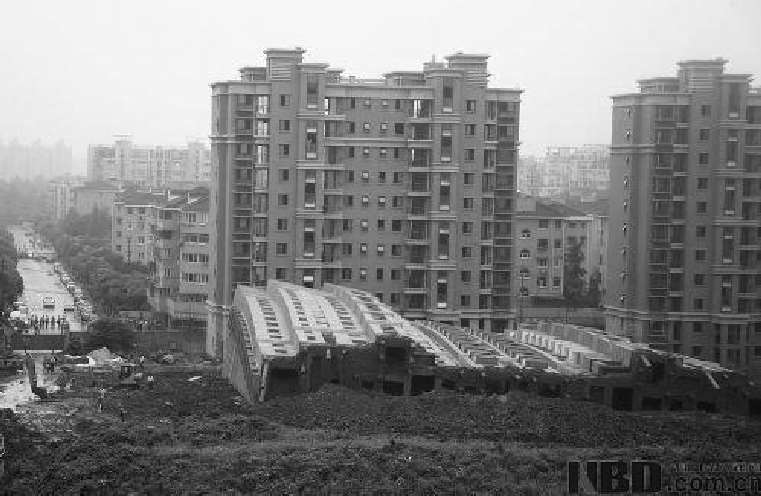 近年来的“楼歪歪”和“楼脆脆”事件更是被人们广泛关注。2009年7月中旬的一场大雨后,某市校园春天小区6号楼和7号楼的一些住户忽然发现,他们两栋楼之间的距离比以往近了很多,两栋斜靠在一起,楼越向上贴得越近。靠得最近的地方,相邻阳台的窗户已经无法打开。经测量,两栋楼相邻的墙壁已经呈20°夹角(图0.2)。校园春天的业主把楼房倾斜的原因归结于在小区旁正在施工的德馨苑小区。业主们认为,德馨苑小区开挖地基后,楼房才发生了问题。而德馨苑小区开发商委托的鉴定机构给出的鉴定报告却认为,楼房倾斜主要是没有按照设计和规范设置排水沟,加上暴雨导致地面积水,引起地基土软化,最后导致建筑物基础沉降。网友们给了这两栋本不该亲密接触的大楼一个响亮的名字:楼歪歪(图0.2)。2009年6月27日清晨5时30分左右,某市莲花河畔景苑小区内一栋在建的13层住宅楼全部倒塌(图0.3),由于倒塌的高楼尚未竣工交付使用,因此,事故并没有酿成特大居民伤亡事故,但造成了一名施工人员死亡。