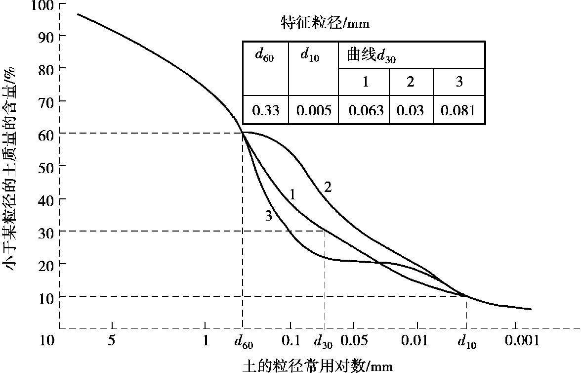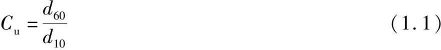 式中: d 10 ——粒径级配曲线上纵坐标为10%所对应的粒径,称有效粒径,mm;