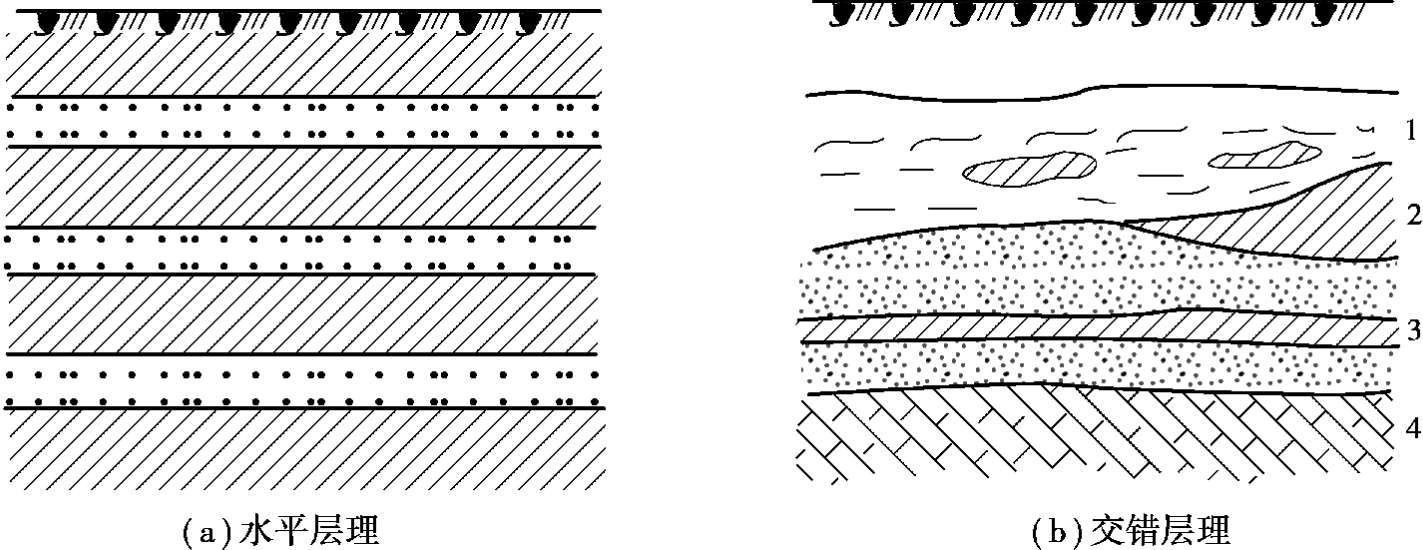 土粒在沉积过程中,沉积的阶段不同,使得不同物质成分、颗粒大小或颜色的沉积物,沿竖向呈现层状特征,这种层状构造反映不同年代、不同搬运条件形成的土层,为细粒土的一个重要特征。常见的有水平层理构造和带有夹层、尖灭和透镜体等的交错层理构造,如图1.6所示。