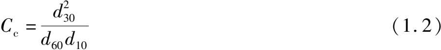 单独用一个指标 C u 确定土的级配情况是不够的,还必须同时考虑级配曲线的整体形状。曲率系数 C c 可以反映颗粒级配曲线的平滑度。 C c 值接近1,曲线平滑,表示土中含有大小不同的土颗粒。
