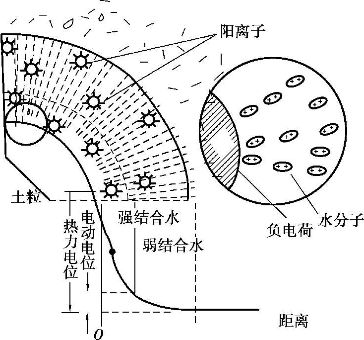 实验表明,大多数矿物颗粒,尤其是细小土粒表面都带有负电荷,在土粒周围形成静电引力场。在土粒电场范围内的水分子以及水溶液中的阳离子(如Na + ,Ca 2+ 等),一同被吸附在土粒表面。另外,由于水分子是极性分子(氢原子端显正电荷、氧原子端显负电荷),因此它受土粒电场的作用而定向排列,被紧紧吸附在土粒表面,如图1.2所示。这样在电场范围内就形成了包围土粒的极薄水膜,称为结合水。