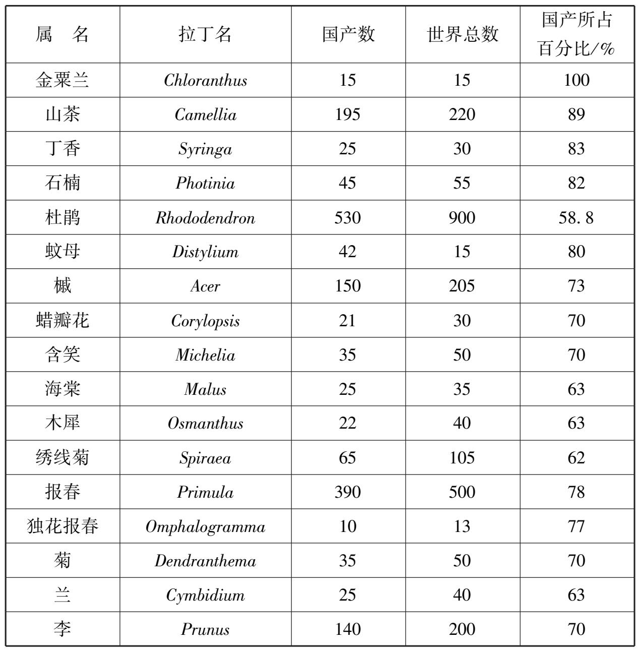 表 1.2 我国原产的园林植物种类与世界种类总数比较