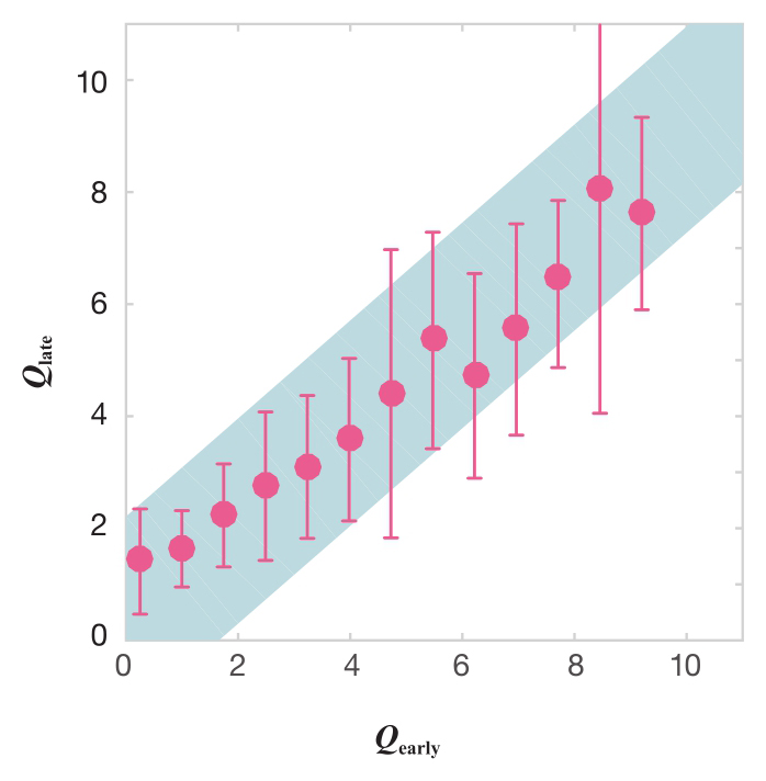 Q 因子会随年龄和经验的增加而增加吗?人们可能会想当然地认为,随着职业生涯的发展,科学家会更善于将构想转化为高影响力论文。要检验 Q 值在整个职业生涯中的稳定性,我们使用至少包含50篇论文的职业生涯数据,利用这些科学家职业生涯早期和后期的论文,由公式6-3分别计算出早期和后期的 Q 因子( Q early 和 Q late )。 Q late 与 Q early 是几乎相同的,说明 Q 值并不会在职业生涯中系统性地增加或减少(见图6-3)。换句话说,科学家的 Q 因子在职业生涯中相对稳定。这提出了一个很有诱惑力的问题: Q 因子能够预测科学家职业生涯的影响力吗?