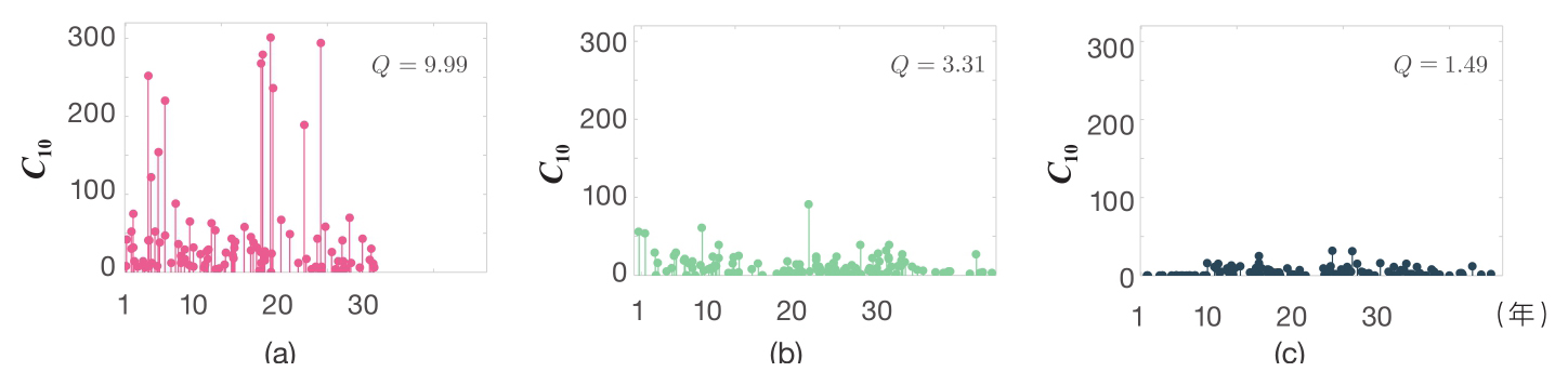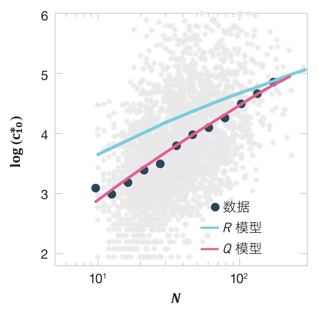 · σ r,N =σ rQ ≈0表明,初始构想的值 r 很大程度上独立于科学家的产出量 N 或者他的 Q 因子。因此,科学家随机地从 P ( r )中寻求灵感,而这一分布对所有人都是相同的,代表着影响力背后普适的运气成分,而这是与科学家个人无关的。