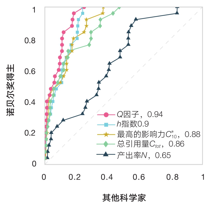 指数。每一条曲线代表以某个给定的排名阈值选取科学家,其中包含了诺贝尔奖得主的比例与其他科学家的比例。对角斜线(也叫无识别率线)相当于随机排序;每一曲线下方的面积代表了对诺贝尔奖得主排序的精确性(在图例中给出,1为最大值)