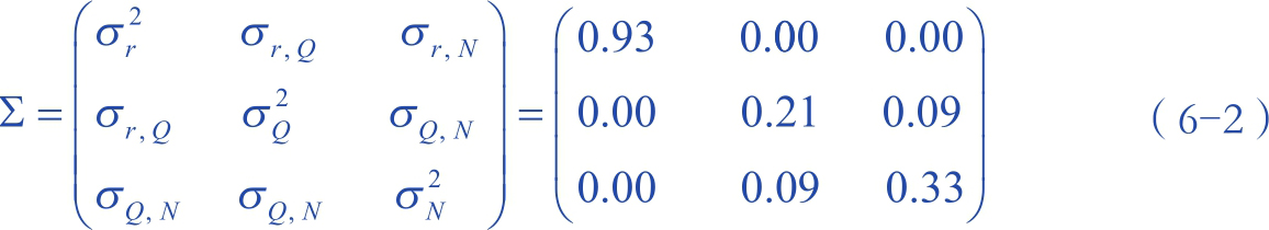 问题在于,不能期待这些因素都相互独立存在: Q 值高的个人可能同时拥有发现高潜力项目的才能,因而他们的 P ( r )分布可能偏向较高的 r 值;那些发表较高影响力论文的人,可能同时拥有更多的资源去发表更多的论文,因而他们的产出量也会很高。也就是说,公式6-1的结果由联合概率 P ( r , Q , N )决定,但 r 、 Q 、 N 之间的相关性是未知的。要了解真实职业生涯的情况,我们需要计算这3个参数之间的相关性。我们最终得到了如下协方差矩阵 [116] 。