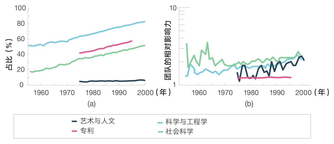 如果只关注排名非常靠前的高影响力论文,那么团队的影响力就更加明显:团队正逐渐成为最重要科研成就的产出主体。虽然在20世纪50年代早期,某一研究领域里引用最多的论文更有可能是由一位作者完成的,但这一模式已在数十年前反转过来 [139] 。今天,在自然科学和工程学领域中,用获得1 000次以上引用的概率来比较的话,团队发表的论文要比只有一位作者的论文高6.3倍。这一规律在艺术、人文科学以及专利领域更为显著。自从20世纪50年代开始,在这些领域中,团队往往会比个人更容易产出最具影响力的研究成果。