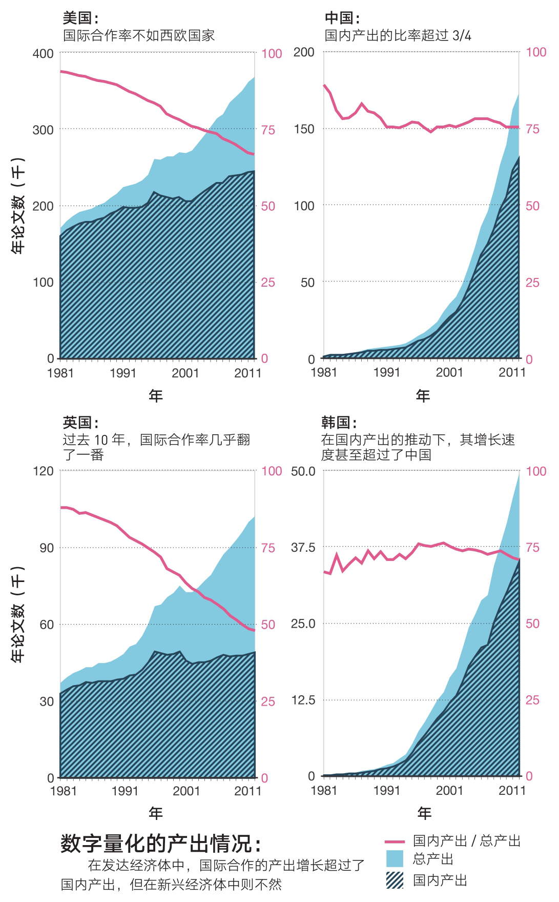 如果某篇论文的全部作者的地址都属于同一个国家,它便算作该国的国内产出。对比左右两侧的图我们发现,国际合作产出的增长在发达国家远超国内产出的增长,但在新兴经济体国家并不是这样。