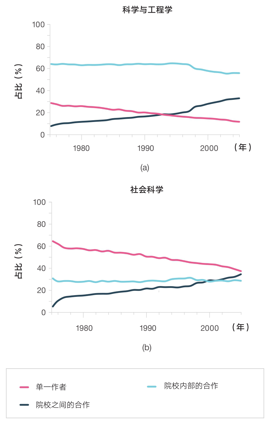 通过比较不同作者类型产出论文的比例,上图证实了1975—2005年,院校之间合作的比例在稳定增长。这种增长在自然科学和工程学(a)和社会学领域(b)特别显著,但在艺术和人文科学领域仍然较弱,在这些领域,任何形式的合作都很少见 [143] 。大学内部合作的比例在此期间基本保持不变,但在自然科学和工程学以及社会学领域,独立作者的论文呈明显下降趋势。