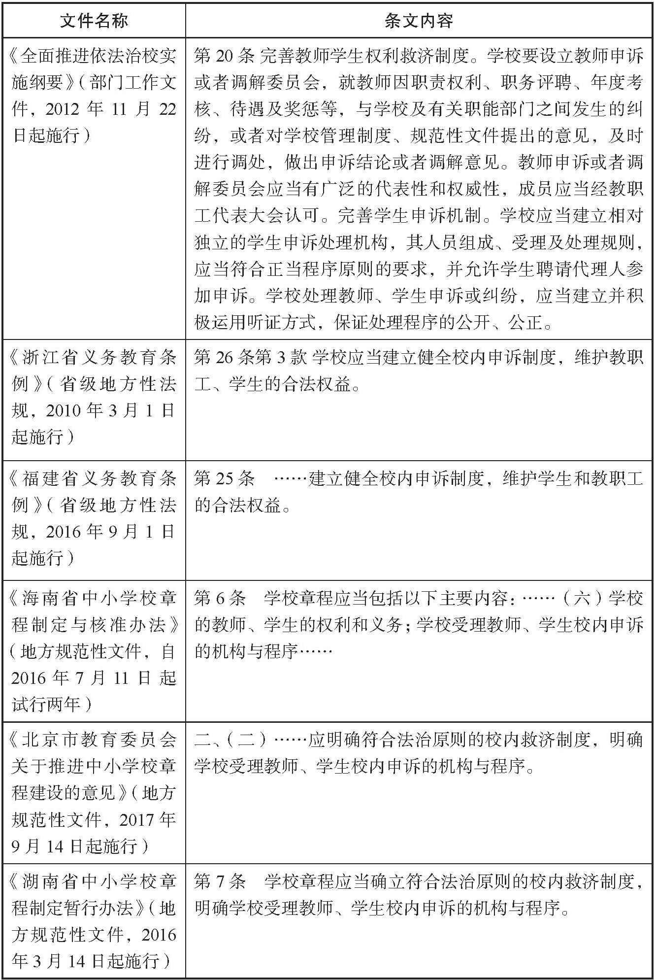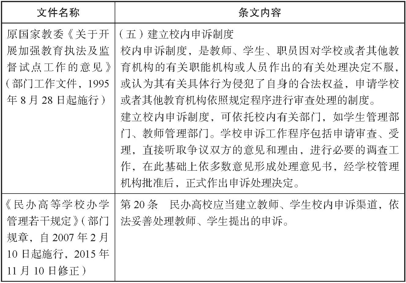 在1994年《教师法》实施后,1995年原国家教委在《关于开展加强教育执法及监督试点工作的意见》中提出了建立校内申诉制度的相关要求。2003年7月,教育部在《关于加强依法治校工作的若干意见》(现已失效)中明确要求:“建立校内教师申诉渠道,依法公正、公平解决教师与学校的争议,维护教师合法权益。”同年11月,教育部将“建立和实行校内教师申诉制度”作为全国依法治校示范创建活动的一条验收标准。此后,一些高校开始陆续制定校内申诉规定,如2005年制定的《广东外语外贸大学广东外语外贸大学教师及其他教育工作者申诉条例》《南京中医药大学教职工校内申诉制度》等。2007年制定的《民办高等学校办学管理若干规定》规定:“民办高校应当建立教师、学生校内申诉渠道,依法妥善处理教师、学生提出的申诉。”2012年制定的《全面推进依法治校实施纲要》第20条规定应当完善教师学生权利救济制度,要求“学校要设立教师申诉或者调解委员会,就教师因职责权利、职务评聘、年度考核、待遇及奖惩等,与学校及有关职能部门之间发生的纠纷,或者对学校管理制度、规范性文件提出的意见,及时进行调处,做出申诉结论或者调解意见”。可以看出,校内申诉制度主要由规范性文件倡导,仅有《民办高等学校办学管理若干规定》是部门规章。而在地方层面,目前仅有武汉市于2017年制定了较为详细的《中小学教师校内申诉处理办法(试行)》,浙江省、福建省等地均在义务教育条例中规定了教师校内申诉制度,但没有规定具体制度内容。此外,还有部分地区在当地制定的中小学校章程制定与核准办法中规定了中小学校应当在学校章程中明确规定学校受理教师校内申诉的机构与程序。