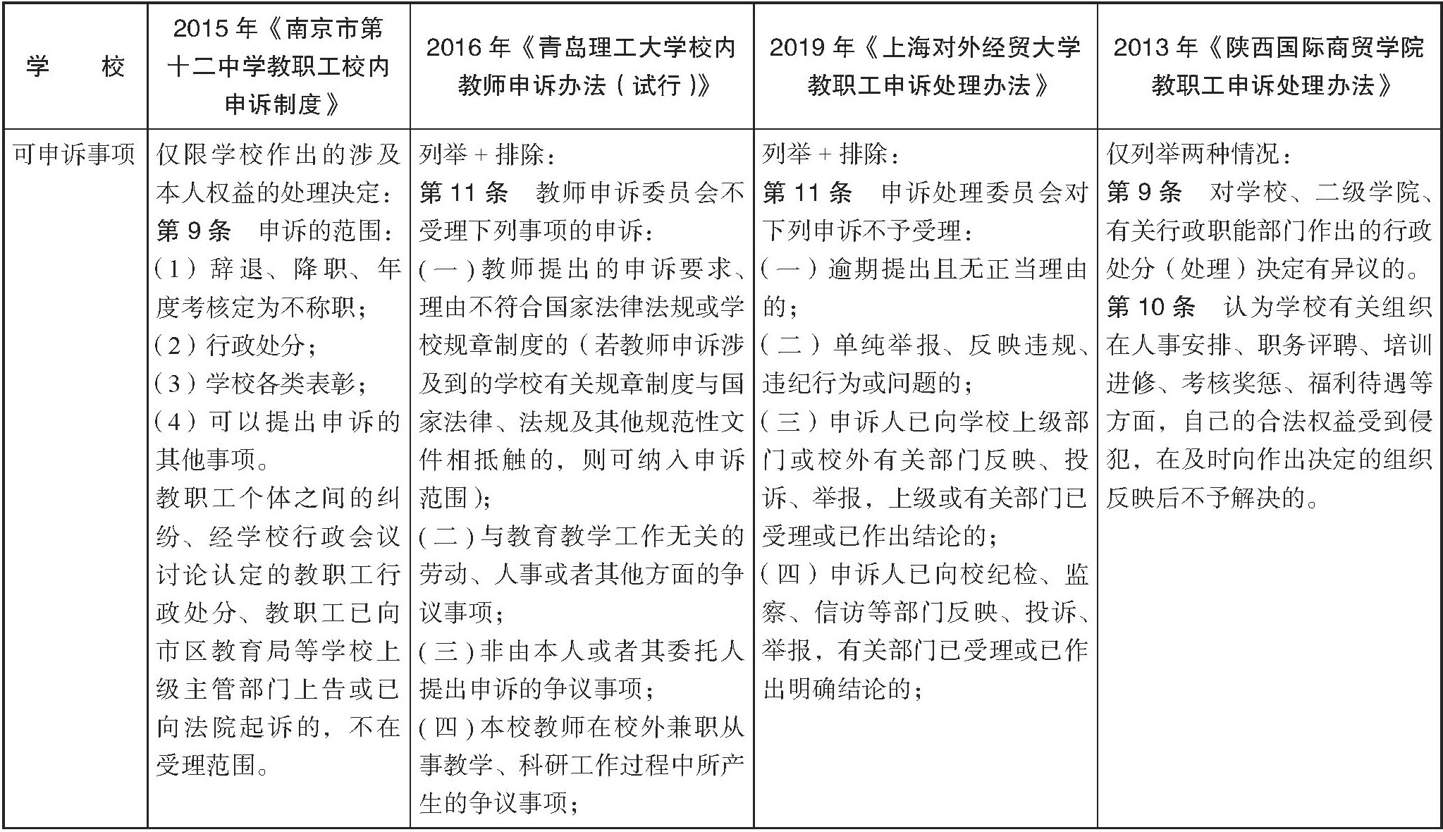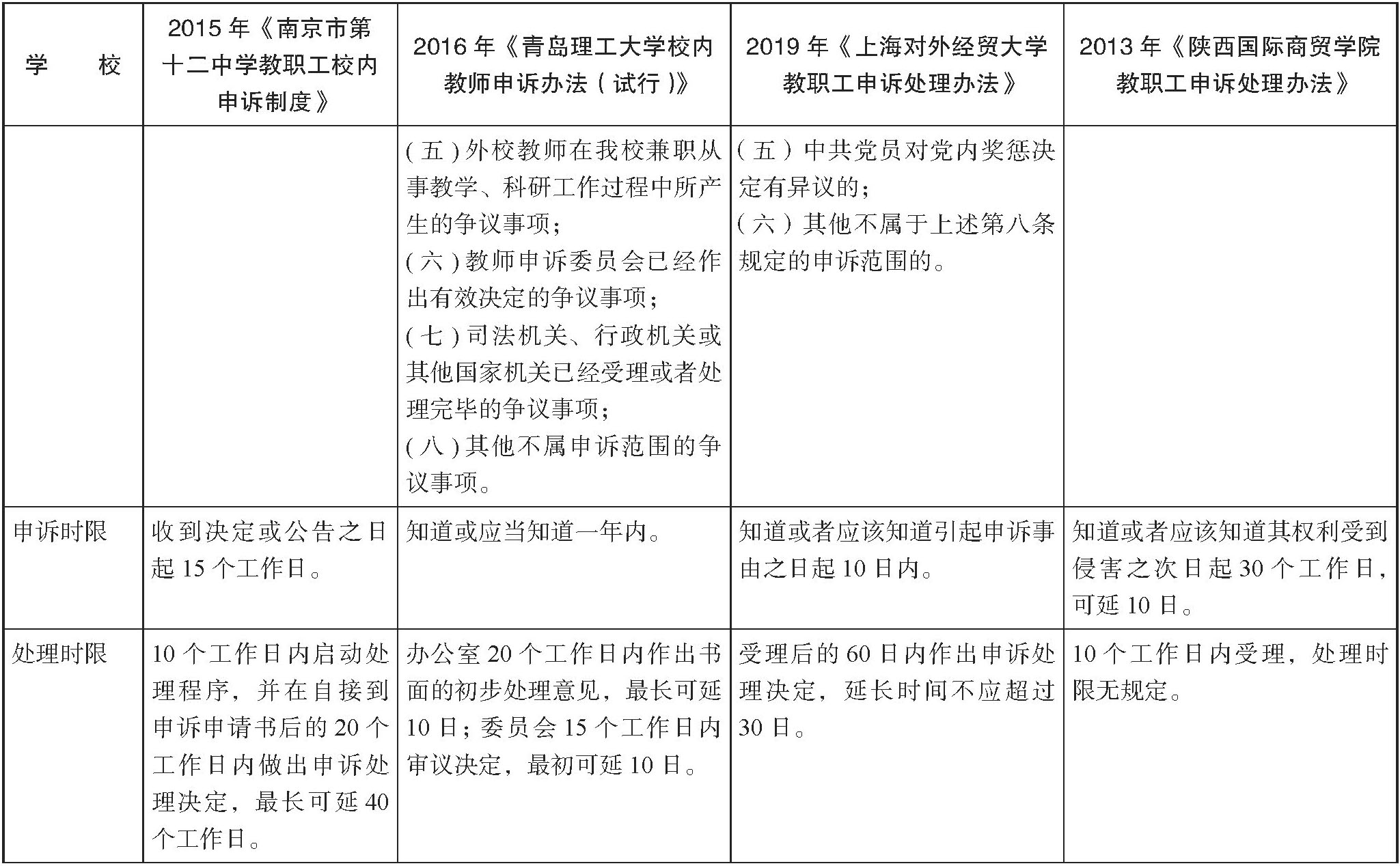 第三,制度适用范围有限。首先,在申诉范围方面,根据《教师法》的规定,教师对学校或者其他教育机构侵犯其合法权益的,或者对学校或者其他教育机构作出的处理不服的,可以向教育行政部门提出申诉。这意味着有两种情况,一种是“教师对学校或者其他教育机构侵犯其合法权益的”,另一种是“对学校或者其他教育机构作出的处理不服的”。但在实践中,一些学校将制度建立限缩于后者,即只有存在一个明确针对教师的处理决定时,才可能提起申诉,如表2的《南京市第十二中学教职工校内申诉制度》。这种情况一般发生于中小学建立的申诉制度。同时规定了两种情况的学校,也存在通过排除法,将较多情况排除在可提出申诉的范围之外的做法。其次,申诉主体有限。对中小学来说,申诉主体一般限制于学校编制的教职工,非编制教职工被排除于适用主体之外;对高校来说,有些学校将申诉制度限制于承担教学职能的教师,不涵盖非教师类职工。但根据原国家教委《关于开展加强教育执法及监督试点工作的意见》,“校内申诉制度,是教师、学生、职员因对学校或者其他教育机构的有关职能机构或人员作出的有关处理决定不服,或认为其有关具体行为侵犯了自身的合法权益,申请学校或者其他教育机构依照规定程序进行审查处理的制度”。其中明确包含了“职员”。此外,大部分高校规定只有本校教职工可以适用,排除了外聘教师或非固定编制的教师。
