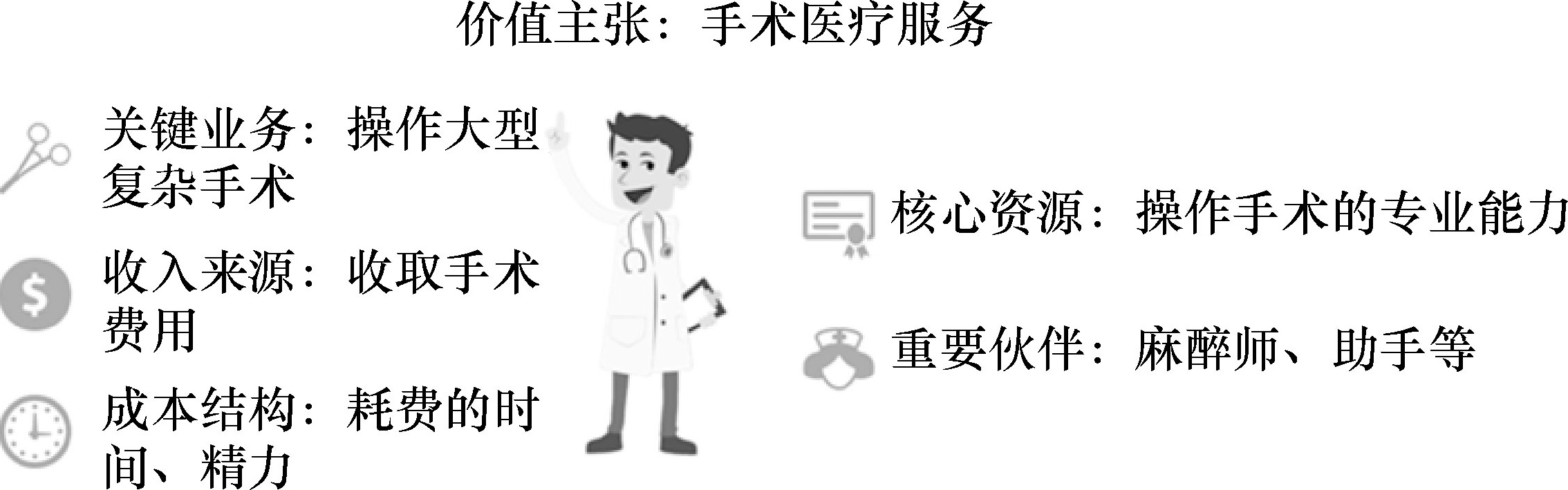 医生提供的“价值主张”即手术医疗服务,“关键业务”即为病人操作大型复杂手术,从而获得“收入来源”;“核心资源”是操作大型复杂手术的专业能力;他还需要与“重要伙伴”即麻醉师、助手合作,才能顺利完成手术;每一次手术都耗费了时间、精力,形成“成本结构”。