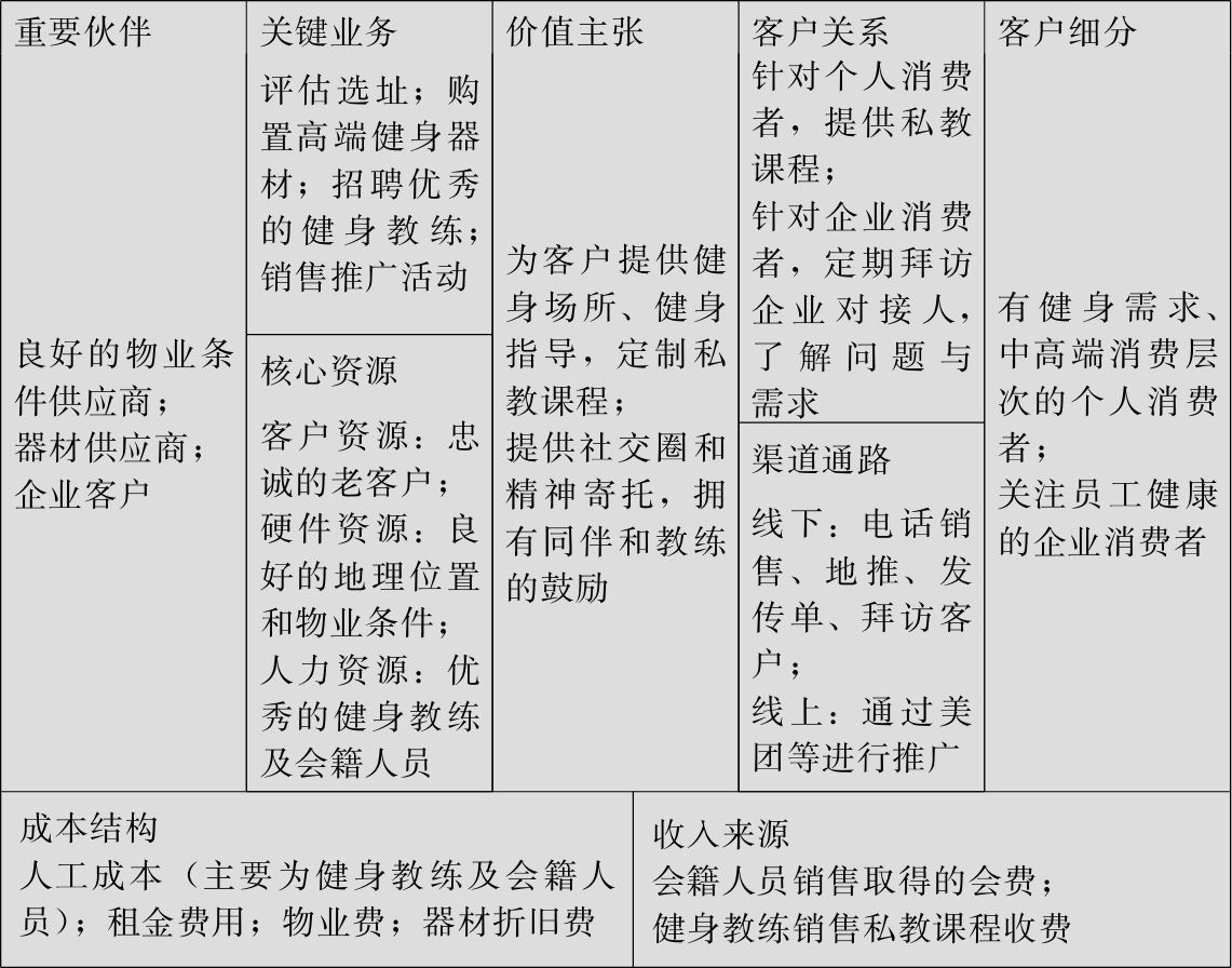 【思考】A企业的使命和愿景是成为中国健身休闲产业最受尊敬的公司之一,并通过为客户提供优质的服务和体验,以及利用品牌价值在行业内实现一定的差异化,因此,它的商业模式画布如图2-3所示: