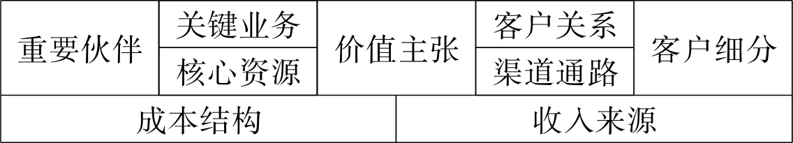 商业模式(business model)描述的是一个企业创造价值、传递价值及获得价值的基本原理或逻辑过程。为有效描述商业模式,我们通常使用“商业模式画布”来直观地展现一个组织或企业的商业模式(如图2-1所示)。