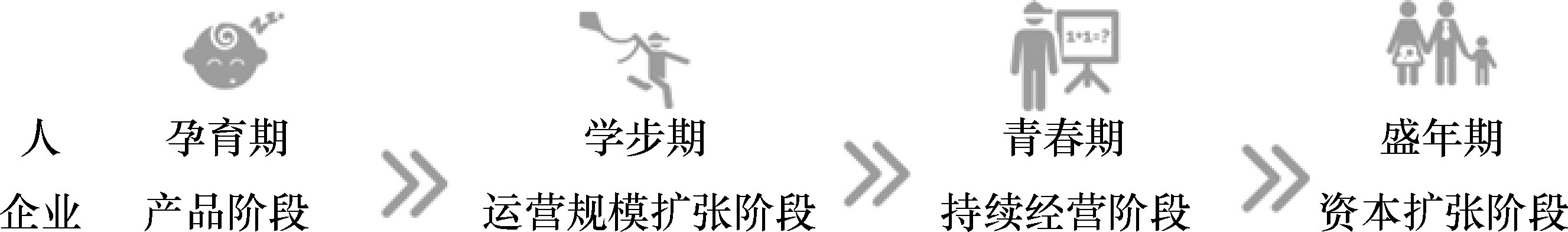 可以将企业生命周期的四个阶段比作人的成长阶段,如图3-1所示。一个企业从创立到发展成熟,类似人从婴儿成长为成年人,企业在成长过程的各阶段会树立不同的价值观,关注不同种类的数据和信息,制定不同的战略规划,由此使得不同阶段的企业经营分析存在差异。