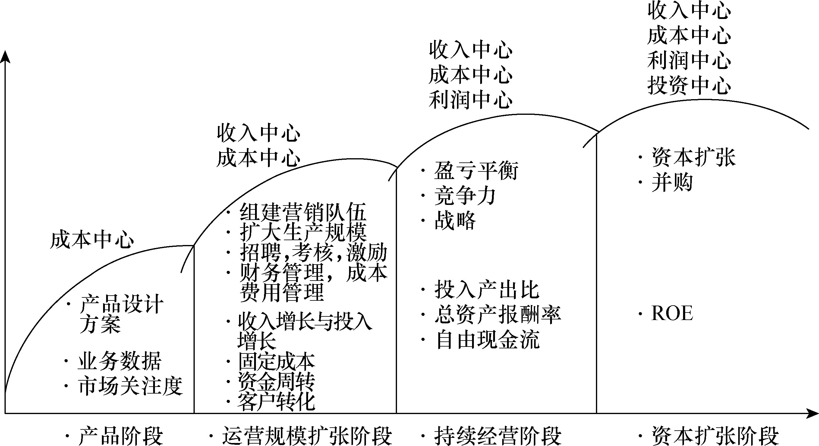 企业发展到该阶段,其业务形成了一定的规律,能用财务数据进行表达,因此企业在经营分析时开始关注财务数据,例如,投入产出比、总资产报酬率、自由现金流等。其中,总资产报酬率也称企业内在成长率,可以衡量企业通过获得的资金创造收益的效率;自由现金流是企业实际可支配的资金部分,来自经营活动现金流量扣除未来的研发、产能投入等支出后的净额,是为企业创造价值以及向投资者分配红利的来源。