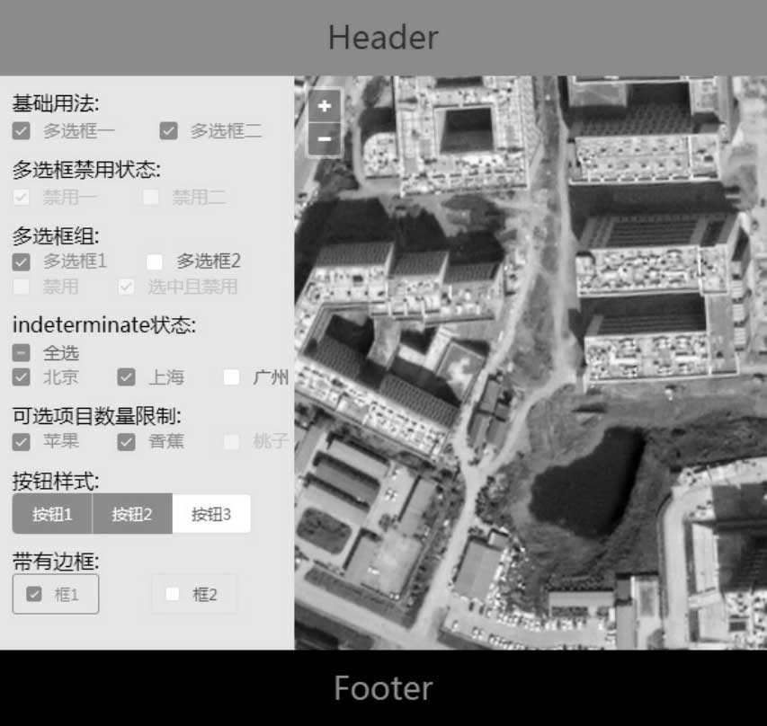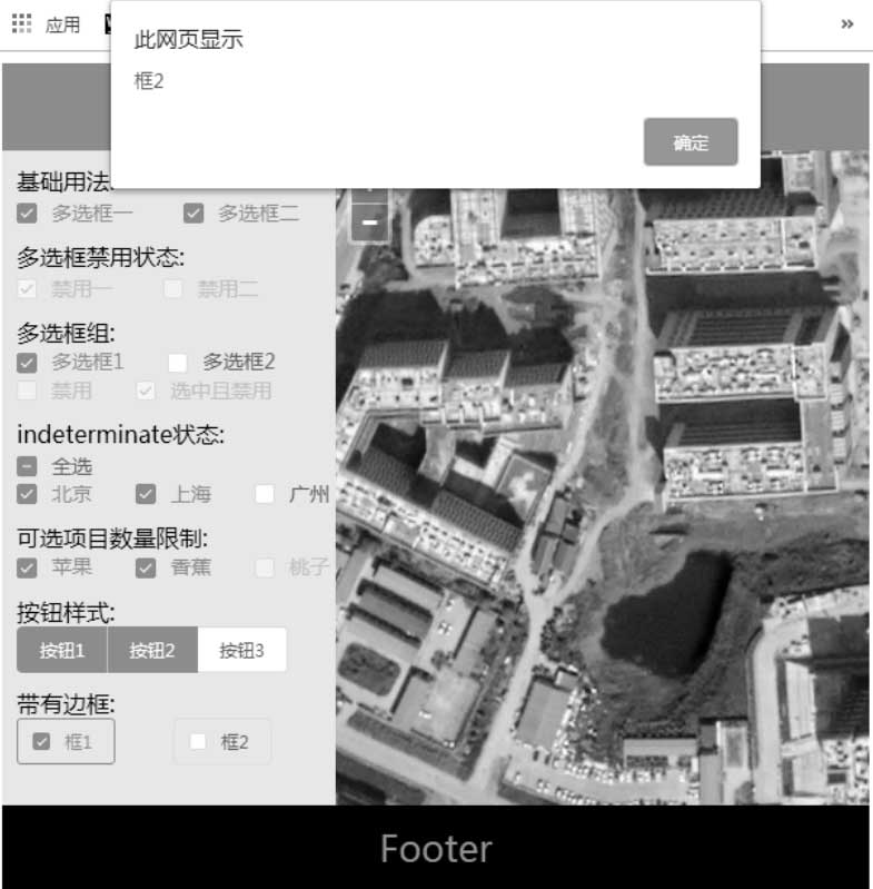 Element为多选框提供了不同的样式与用法,本节将从基础用法、多选框禁用状态、多选框组、indeterminate状态、可选项目数量限制、按钮样式、带有边框等方面讲解多选框的样式与用法。本节首先结合地图展示多选框的样式,如图 3-2 所示;然后对多选框的样式与用法进行讲解。