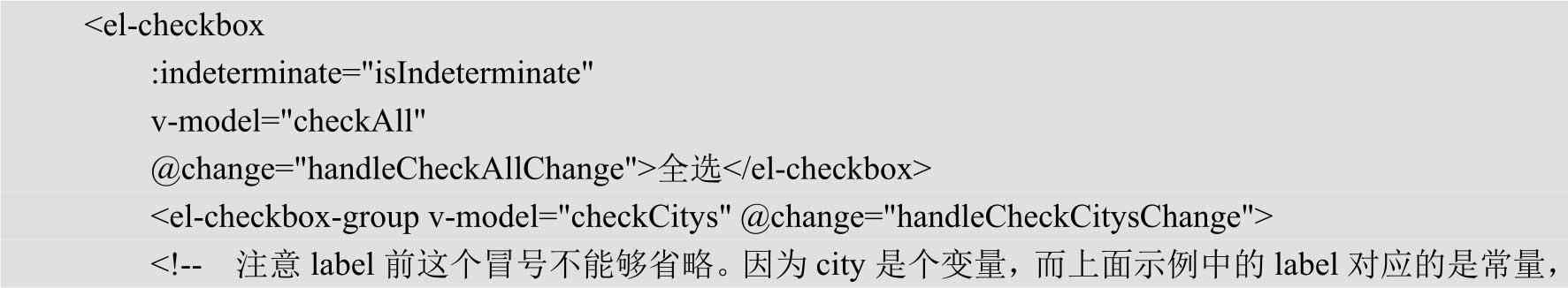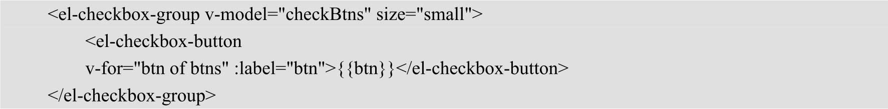 (6)按钮样式。与单选框的按钮样式类似,Element同样为多选框提供了按钮样式,只需要将el-checkbox改为el-checkbox-group即可实现多选框的按钮样式。代码如下:
