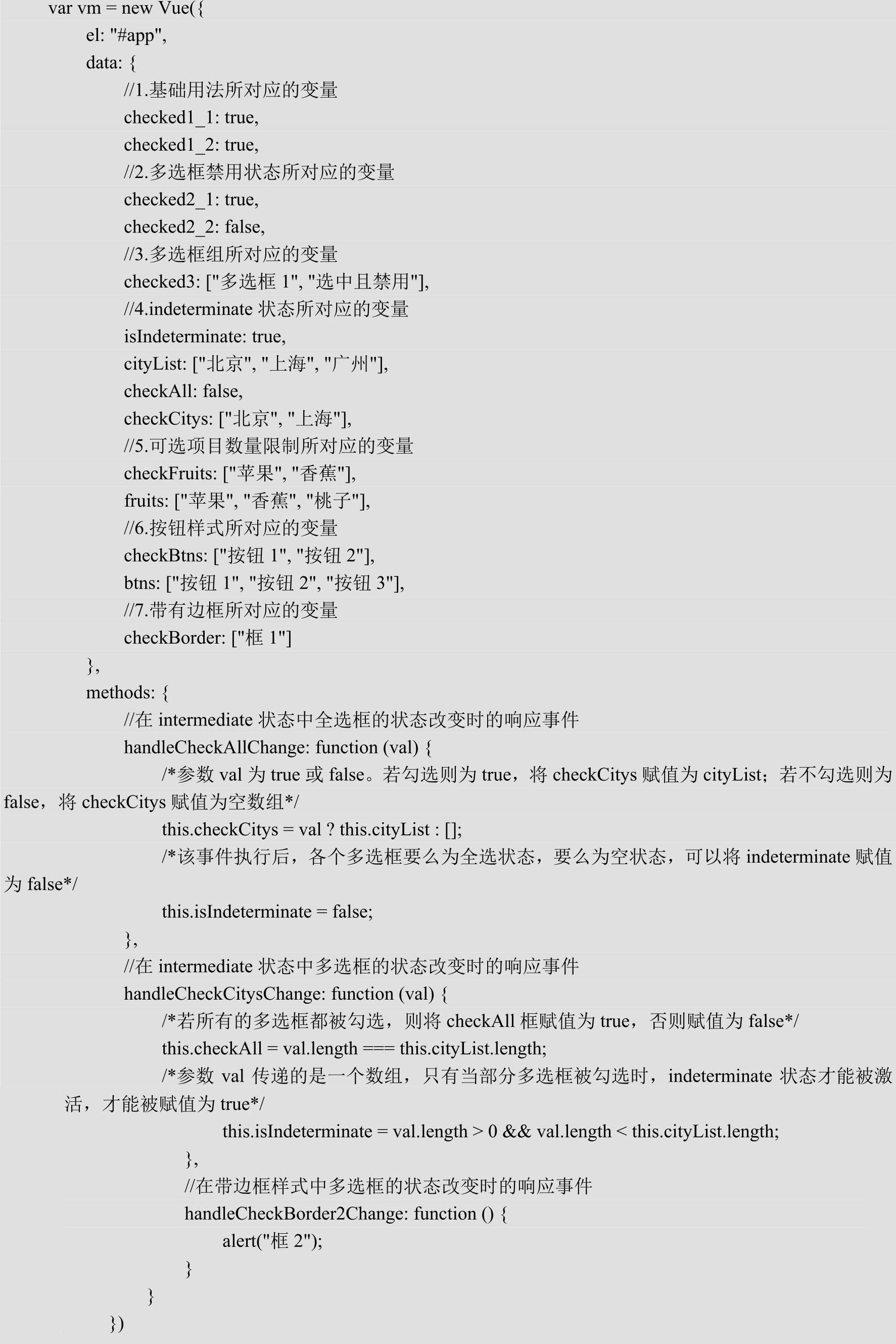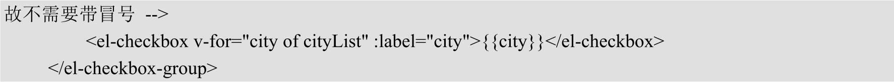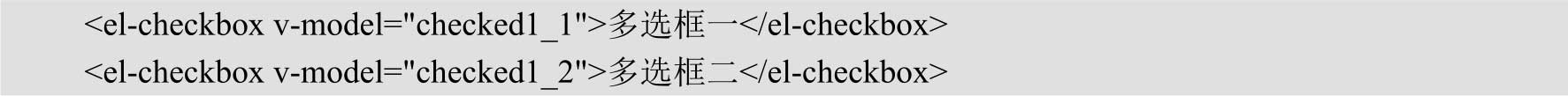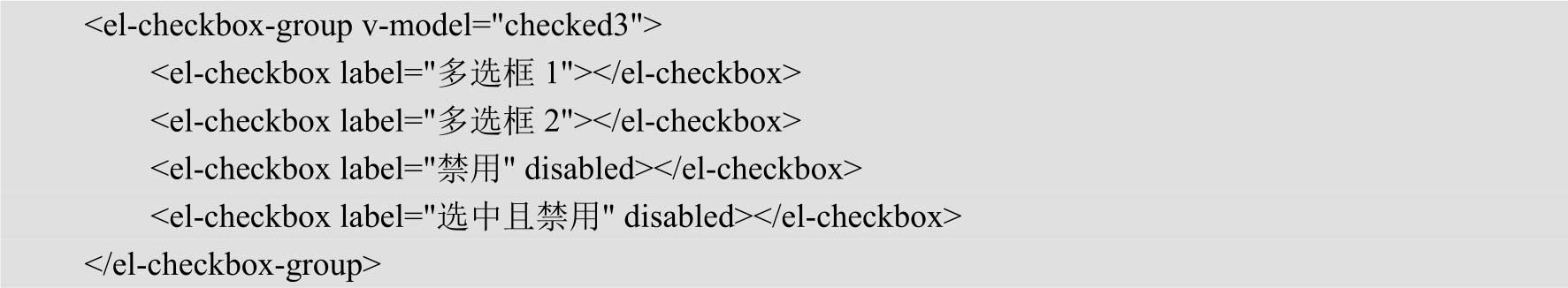 (3)多选框组。与单选框组类似,多选框组同样是为了把多个元素合并为一组进行管理。通过el-checkbox-group标签与多个子元素el-checkbox标签的结合可实现多选框组。在el-checkbox-group标签中使用v-model绑定一个数组,将该数组的元素与各el-checkbox标签中的label属性的值进行匹配,可以决定各个多选框的选中状态。代码如下: