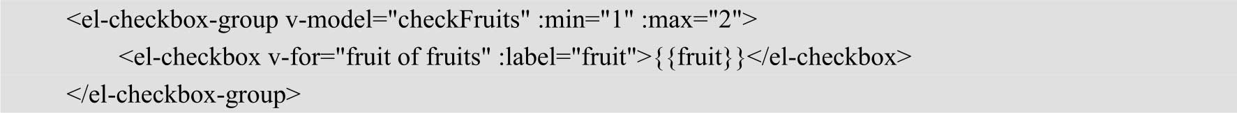 (5)可选项目数量限制。在某些情况下,需要对多选框的最少选中状态和最多选中状态进行限制。只需要在el-checkbox-group标签中设置min和max属性即可实现可选项目数量限制。