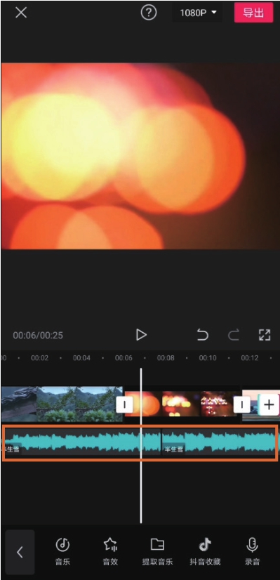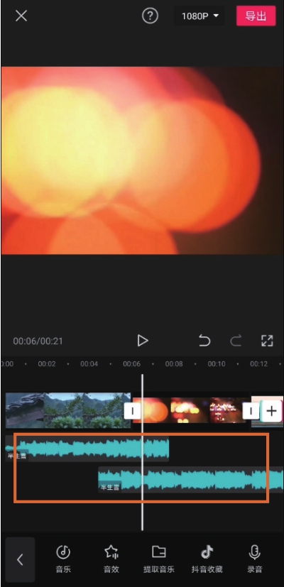 例如图2-17所示中有两条音频轨道,如果配乐在时间线上不会重叠,则可以长按其中一条音轨,将其与另一条音轨放在同一轨道上,如图2-18所示。