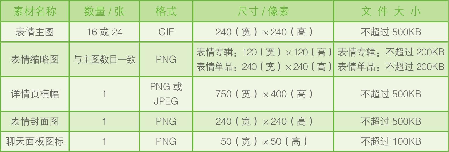 · 表情单品缩略图:240像素(宽)×240像素(高),每张大小不超过200KB。