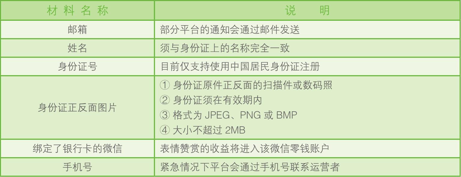 当权利主体为个人时,需提供个人身份证明进行注册。开通表情赞赏功能后,表情赞赏的收益将进入个人微信零钱账户。个人账号注册材料的要求与说明如下。