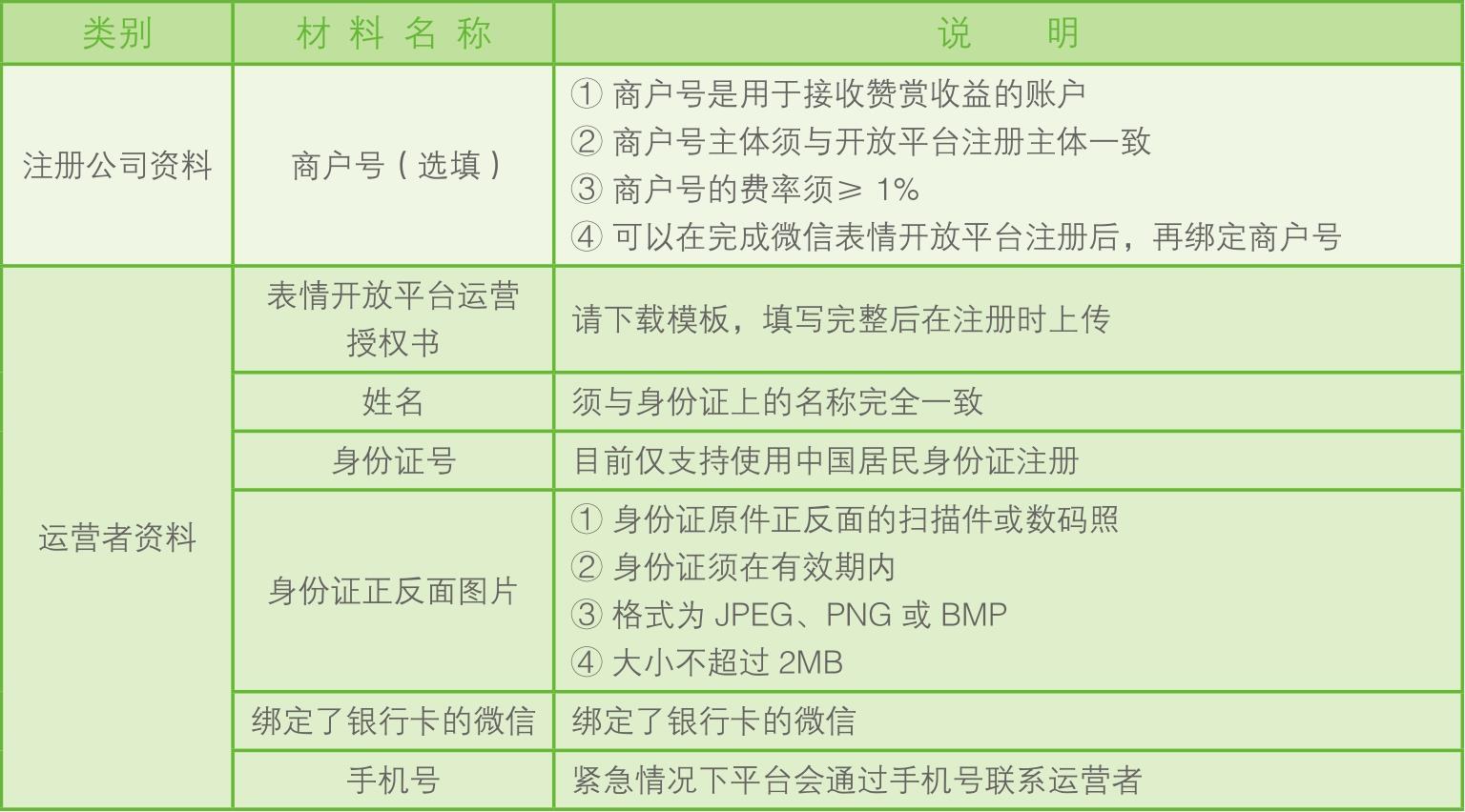 公司或工作室注册的微信表情平台账号权利主体为企业。开通表情赞赏功能须先绑定公司对公的微信支付商户号,表情赞赏的收益将进入该商户号。企业账号注册材料的要求与说明如下。