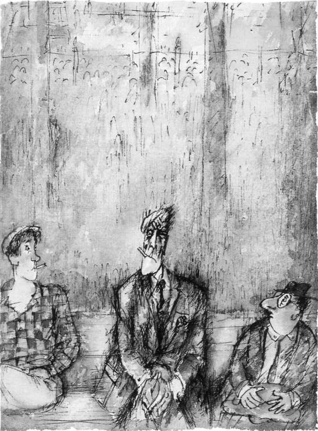 湖畔出现了两个男人。身材矮小的那个穿一身浅灰色夏季西装,膘肥体壮,光着秃头,手里郑重其事地托着顶相当昂贵的礼帽,脸刮得精光,鼻梁上架着一副大得出奇的角质黑框眼镜。另一个很年轻,宽肩膀,棕黄头发乱蓬蓬的,脑后歪戴一顶方格鸭舌帽,上身穿方格布料翻领牛仔衫,下面是一条皱巴巴的白西服裤,脚上蹬一双黑色平底鞋。