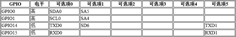通常GPIO引脚有3个状态——上拉(pull-up)、下拉(pull-down)以及连接(connect)。连接状态指的是既不上拉也不下拉,仅仅连接。上述代码已把GPIO14和GPIO15设置为连接状态。