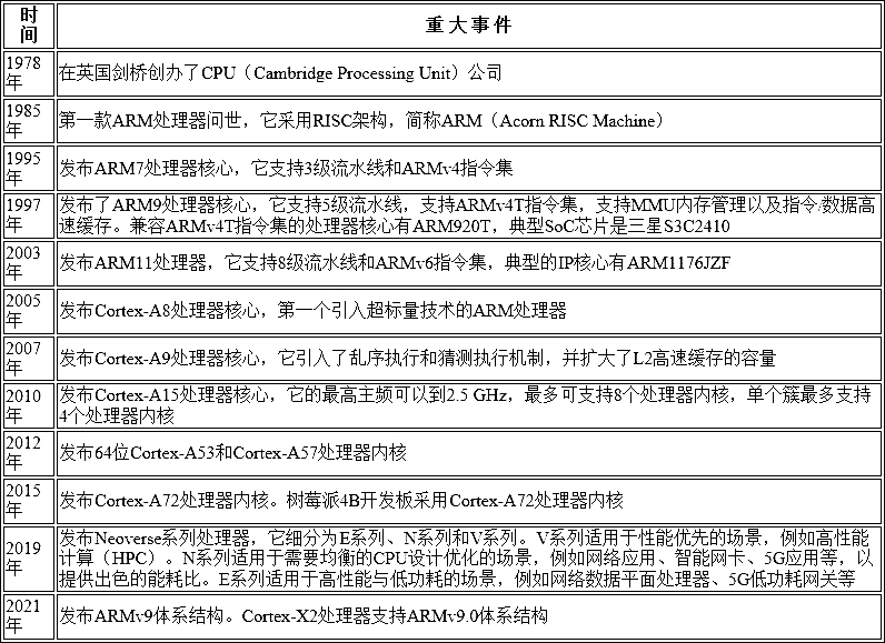 ARM公司主要向客户提供处理器IP。通过这种独特的盈利模式,ARM软硬件生态变得越来越强大。表1.1展示了ARM公司重大的历史事件。