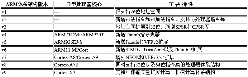 从最早的ARM处理器开始,ARM体系结构已经从v1版本发展到目前的v8版本。在每一个版本的体系结构里,指令集都有相应的变化,其主要变化如表1.2所示。