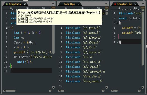 在UltraEdit文本编辑窗口可对文档进行编辑,当鼠标指针指向对应的文件名时会弹出该文件的完整路径、文件大小、详细的创建时间、详细的修改时间等信息。拖动文件可分隔多个文本编辑窗口,对于每个文件的文件名,可使用不同颜色和形状标识文件编辑状态,绿色圆形表示文件有改动并已经保存,红色菱形表示文件有改动但未保存,无颜色无形状表示文件未改动。文本编辑区可显示行号、能使用不同颜色标记不同的代码。图1.3所示的代码中,用橘黄色标记库函数和运算符,用蓝绿色标记关键字,用淡黄色标记头文件,用白色标记自定义代码和函数,用紫色标记常量。UltraEdit可以折叠程序段(用“{}”括起来的代码段)使编辑区更简洁,代码逻辑更清晰,单击程序段的“{”所在行的“⊟”图标可折叠该段程序,折叠后“⊟”图标变成“⊞”图标;单击“⊞”图标可展开该段代码。UltraEdit文本编辑窗口如图1.3所示。