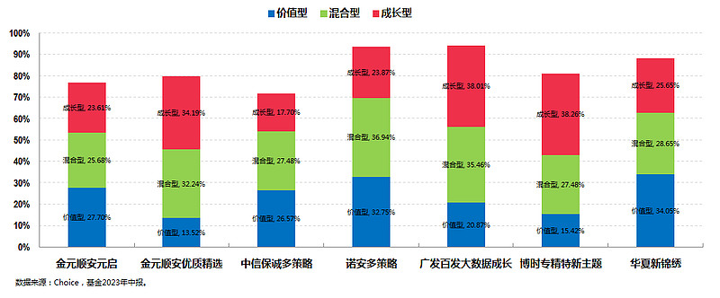 金元顺安元启、中信保诚多策略、诺安多策略以及华夏新锦绣都属于均衡偏价值的风格,而金元顺安优质精选、广发百发大数据成长和博时专精特新则都属于均衡偏成长的风格。