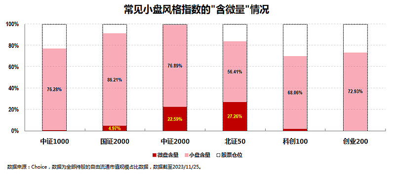 这里还可以顺便提一嘴的是,在所有宽基类小盘风格指数中,“含微量”最高的指数便是最近风头正劲的北证50指数,但其27.26%的“含微量”肯定也无法被称为微盘股指数。类似的还有“含微量”22.59%的中证2000指数。