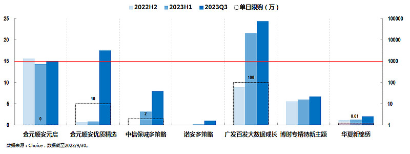 除了彻底“封闭”的金元顺安元启,单日限购100元的华夏新锦绣已经形同“封闭”,唯一“平替”中信保诚多策略单日限购2万,总规模已然超过15亿的金元顺安优质精选和广发百发大数据成长则分别单日限购10万和100万。