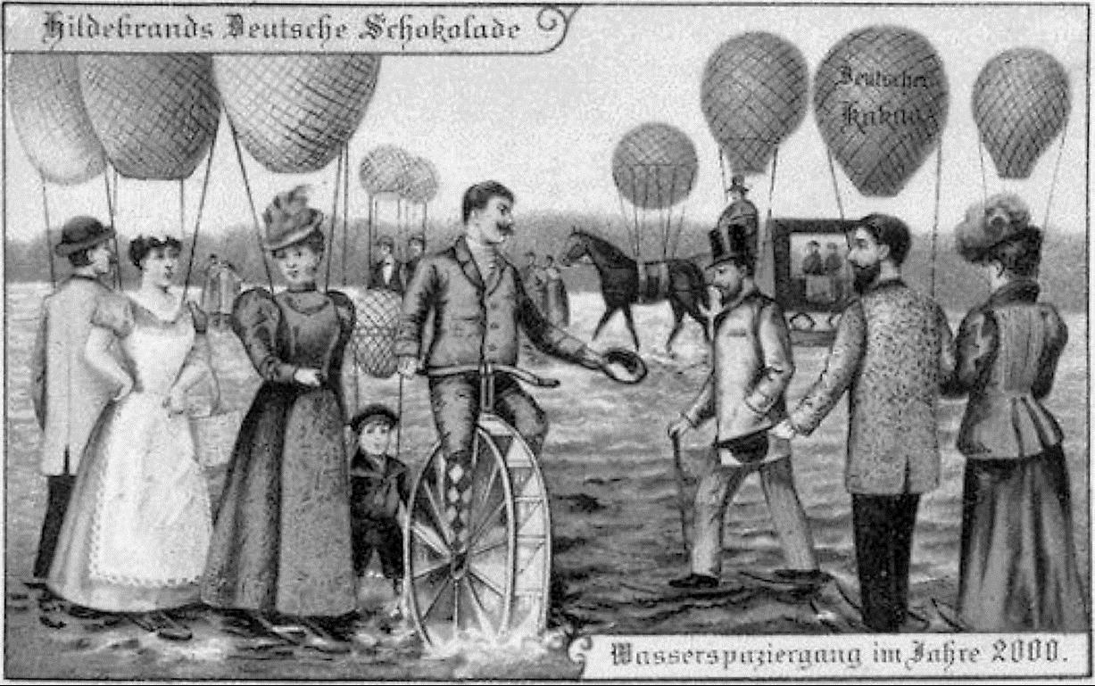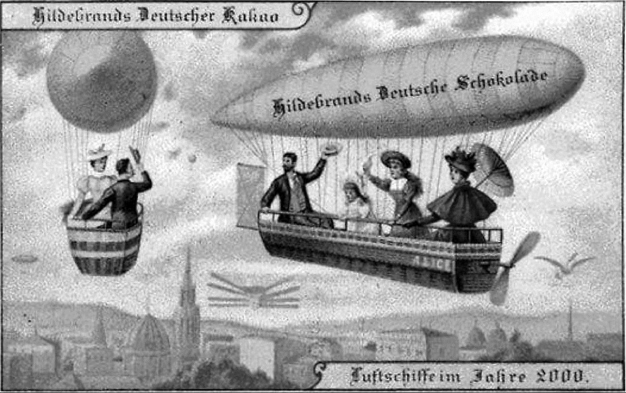 史学研究是波浪形前进的。自司马迁以来,宏大叙事与微观研究一直在交替出现;即便是近代以来,这样的现象依旧存在。这不以意识形态为转移,而是人类思维的普遍规律。摆脱史料话语权的中心主义,揣摩史料中“主观意识表达”之外的无意识心态才是目下当务之急。在这个过程中,微观研究不可或缺,甚至是目前的主要任务之一。在此笔者与诸位读者分享几幅图画,1900年德国巧克力公司Hildebrands绘制的“畅想21世纪”明信片,这里直观、生动地展示了什么是“主观意识表达”之外的无意识心态。