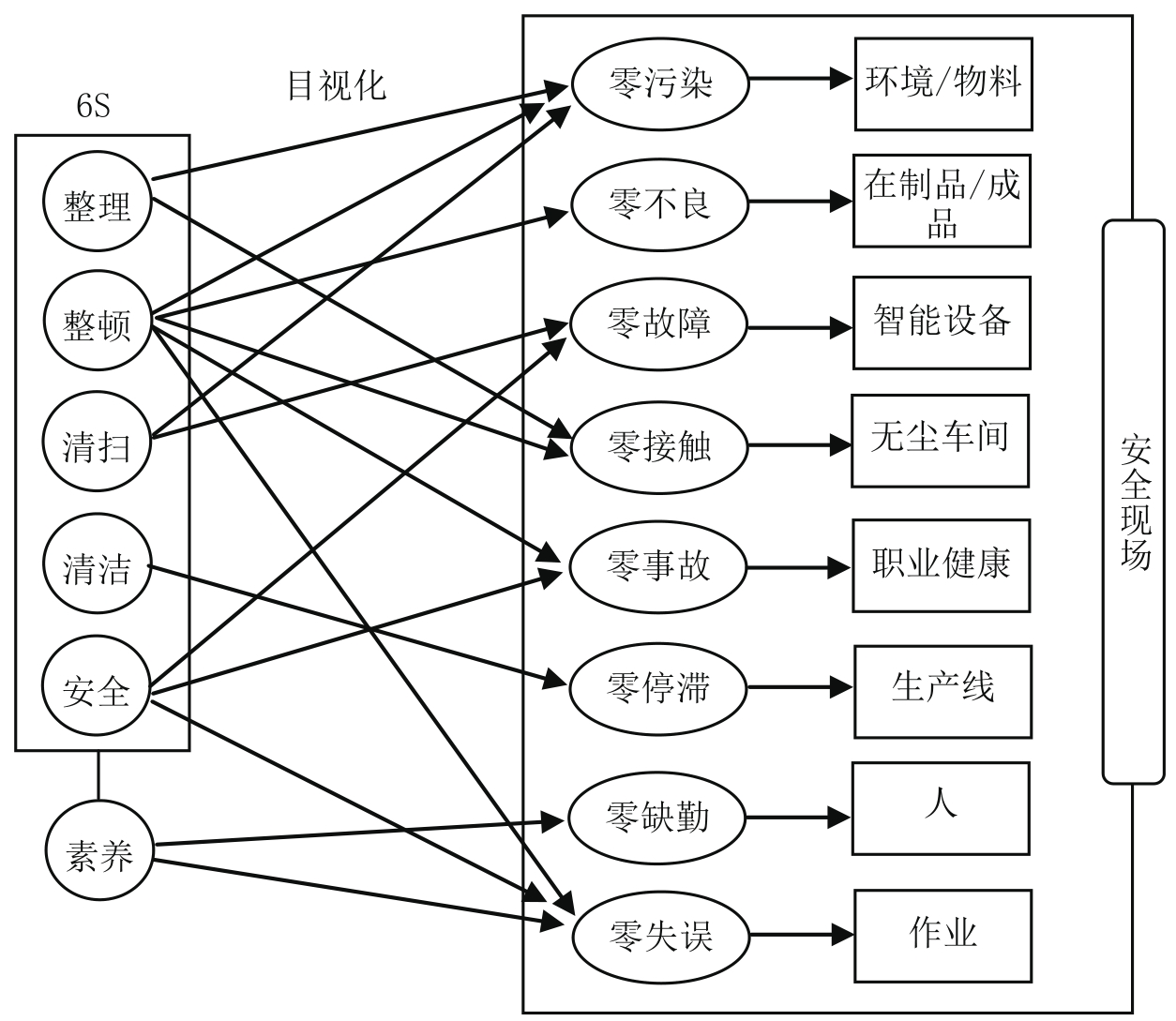 智能工厂各类设备在调试期间,要完成安全标识、防护装置的安装工作。6S与智能工厂现场安全关系如图1-19所示。