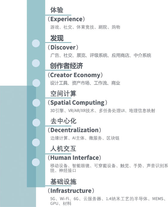 从用户所需的生活场景的体验到可以让元宇宙概念落地的技术,构建元宇宙涵盖了几万亿规模市值的产业链,Bearable的创始人乔·拉多夫(Jon Radoff)总结了构建元宇宙的七层要素并列出了各要素所涵盖的各个行业(见图1.13)。
