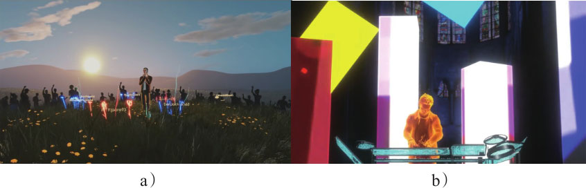 元宇宙中的体验并不是打造简单的立体空间中的沉浸感,它可以把人类生活场景的方方面面映射进数字世界。当物理世界数字化之后,体验可以变得更加丰富。元宇宙可以帮助人类拓展边界,在虚拟世界中,可以获得在现实世界中无法拥有的体验。图1.14展示了两场虚拟音乐会,图1.14a是贾斯汀·比伯(Justin Bieber)在Wave Presents上举办的虚拟音乐会,粉丝可以在线上跟比伯的虚拟形象互动;