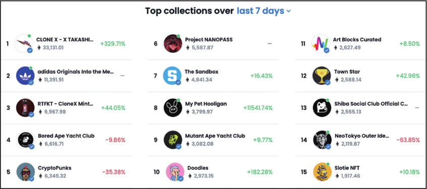 发现层能够使元宇宙构造创作者经济生态,未来,人们有极大的可能在这一层产业中获得丰厚的利润,实现Play-to-Earn。互联网时代,人们已经发现利用网络流量生产内容进行营销是一种高效率的变现模式,移动互联网时代滋生的诸多自媒体都是依靠这种形式来赚取利润。而在元宇宙时代,以生产、贩卖及消费内容为主的生态将会更加便捷和普遍。人们可以将自己创造的内容或产品数字化,用自己的创意获取利润。最近兴起的NFT就是一种逐渐成熟的技术。NFT非常符合元宇宙去中心化的特性,可以激发更多的创作者参与进来,把内容置换为数字资产。图1.15展示了Opensea上过去7天NFT的交易排行榜。Opensea是目前最大的NFT交易市场,用户可以在Opensea上使用美元或虚拟货币Ether售卖或购买虚拟头像、域名、音乐、虚拟场景等NFT。可以看出,大部分的NFT交易涨幅都非常大,排名第一的CLONE X的涨幅达到了329.71%。