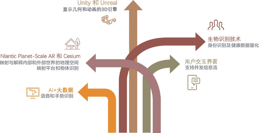 空间计算是实现元宇宙世界与现实世界无缝切换的关键技术。空间计算让人类创造并进入虚拟的3D空间成为可能。其中主要包含3D引擎技术、生物识别技术、地理空间映射技术、用户交互技术及AI和大数据技术(见图1.16)。这些技术共同作用,使得人们可以随时随地进入元宇宙世界。空间计算技术也是实现元宇宙世界的技术难点。
