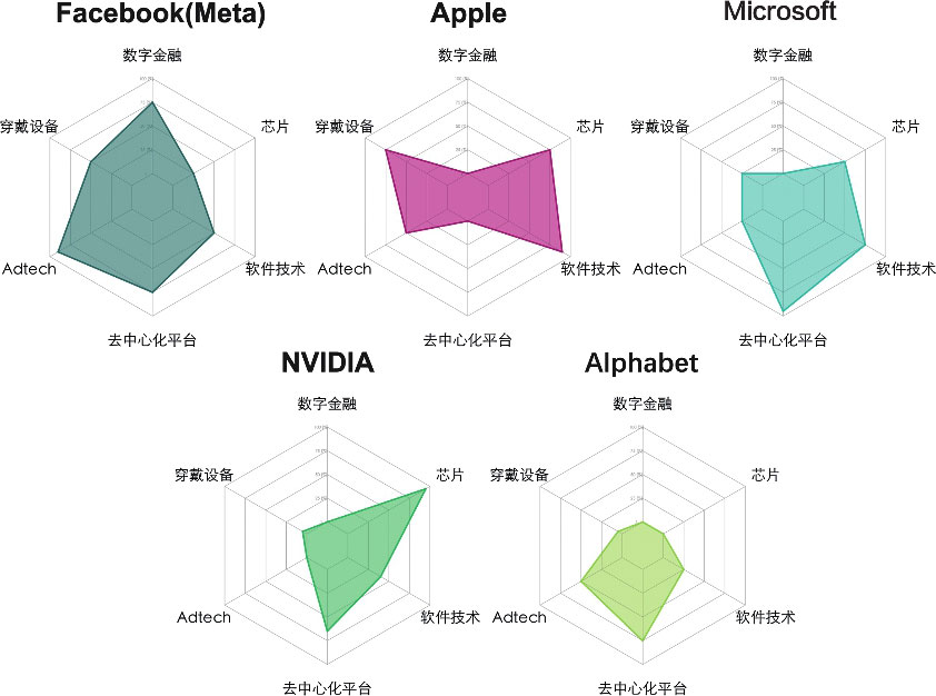 图1.17用雷达图展示了目前五个头部科技巨头公司对元宇宙的布局情况。布局分成数字金融、穿戴设备(包括AR/VR及传感器等)、Adtech(主要做内容及营销)、去中心化平台、软件技术(包括云计算、空间计算及AI等技术)和芯片六个方向。由图可知,目前Facebook的元宇宙布局相较于其他四家公司更为均衡,且是唯一一家涉足数字金融领域的科技公司。Apple及NVIDIA在芯片领域较其他公司有较大的发展,除此之外,Apple还大力研发穿戴设备和软件技术,但是Apple在去中心化方面是五个公司中最落后的。微软在去中心化方面则相当出色。Alphabet