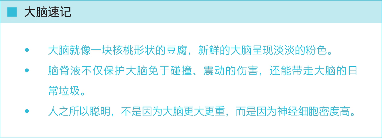 你的大脑看起来像一块核桃形状的豆腐。准确地说,它的质感介于新鲜年糕和嫩豆腐两者之间。它的表面皱巴巴的,看起来像一个巨大的核桃。如果你有机会看到泡在福尔马林中的真人大脑标本,那会更加直观。福尔马林是一种有防腐和消毒作用的液体,确切地说,是浓度为40%左右的甲醛水溶液,常被用于保存器官。为了能够长期保存,大脑上的血管都被去除,且进行了脱水处理,所以福尔马林中的大脑整体看起来是灰色调的。但要注意的是,新鲜的大脑看起来呈淡淡的粉色,而不是泡在福尔马林里显出来的灰青色。