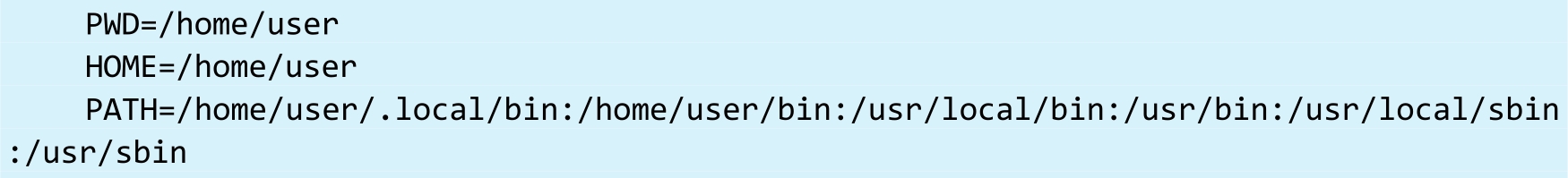 该命令的部分输出结果如下所示,每一行就是一个环境变量的设置,其中,“=”的左侧是环境变量名,全部使用大写字母,如PWD、HOME、PATH全都是大写,如果一个环境变量名有很长,如SELINUX_ROLE_REQUESTED,则可以使用下画线(_)进行分隔;“=”的右侧是环境变量的值,例如PWD的值是/home/user,HOME的值是/home/user。在该bash上启动的程序,可以访问这些环境变量的值,并根据它们的值做不同的动作。