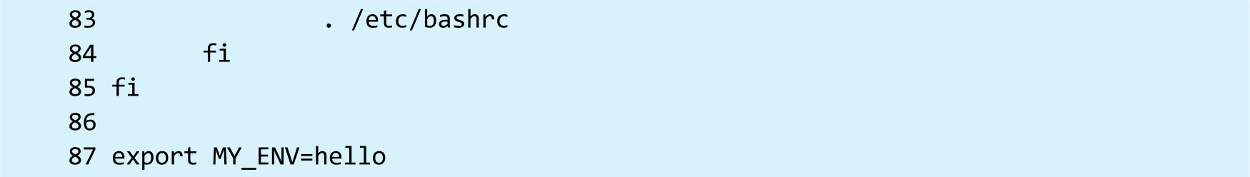 /etc/profile用于全局设置,在该文件中设置的环境变量,不管这个bash的用户是谁,都会在每个bash中生效。环境变量设置通常添加在/etc/profile末尾,如下第87行所示。