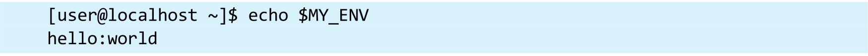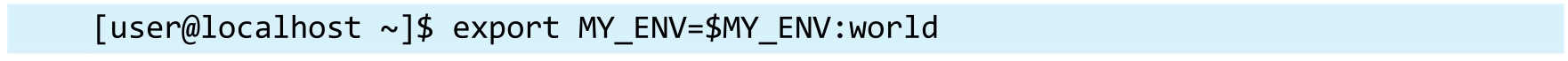 如果要在已有的环境变量上增加内容,例如在MY_ENV变量后面增加新的字符串world,中间使用冒号(:)作为分隔,则可以使用$MY_ENV来表示该变量之前的值,示例如下。