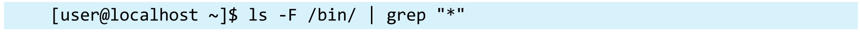 利用管道 |,将ls的输出作为grep命令的输入,过滤所有扩展名为 * 的文件,命令如下,可以得到 /bin/ 下所有的可执行文件。